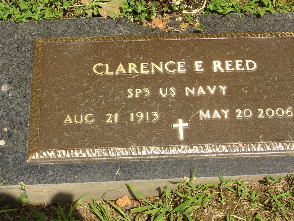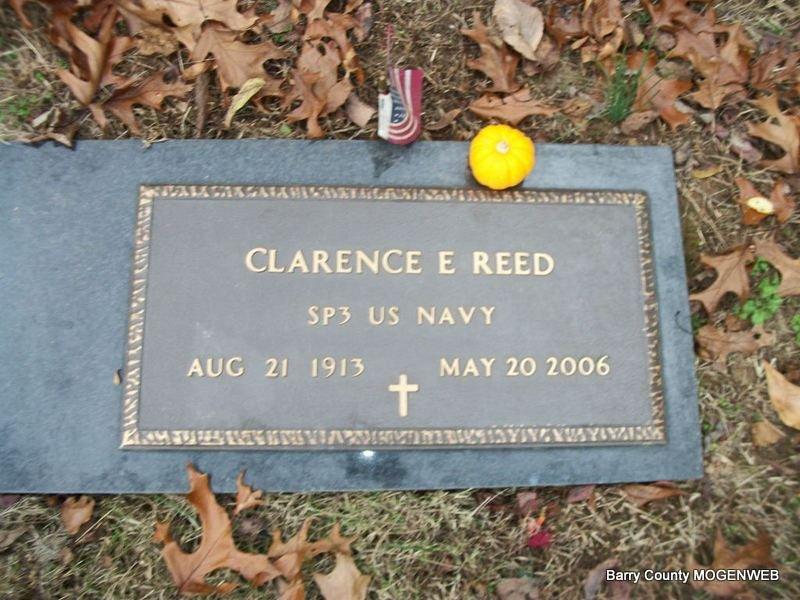 Inscription: "SP3 US NAVY" - Research Note: Son of John P. and Jewel (Ellis) Reed. On Dec. 29, 1938, in Monett he was united in marriage to Kathleen Carney. He was preceded in death by his parents, one brother, Bill Reed, one sister, Annabelle Bass, two brothers-in-law, Everett Wheeler and Gene Bass. He attended the University of Missouri Law School in Columbia and graduated in 1936. He was a State Legislator for two years (1939-1940). During World War II Clarence was in the United States Coast Guard. He worked as an attorney for the Veterans Administration for thirty years following his discharge. He was in private practice with Emory Melton Law Offices for 15 years. - Another Photo | Cassville Democrat Phyllis Long Photo BCG and HS Photo Diana Cope |