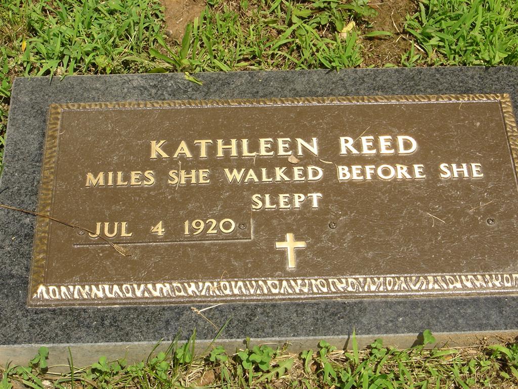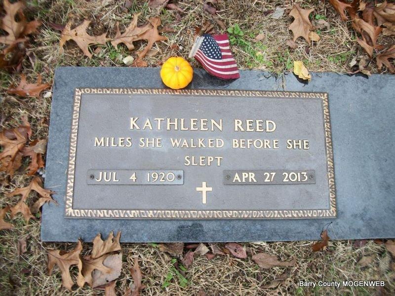 Inscription: "Miles She Walked Before She Slept" - Research Note: She was the daughter of William A. and Maud (Brooks) Carney. On December 29, 1938, in Monett, Missouri, she was united in marriage to Clarence E. Reed, who preceded her in death on May 20, 2006. Also preceding her in death were her parents and one brother, Bill Carney. Kathleen received her education at Sparks Elementary School and was a 1936 graduate of Cassville High School. At the age of sixteen, Kathleen entered Henrotin Hospital School of Nursing in Chicago. She attended University classes there for two years. In 1938, she met her husband, Clarence Reed and they were married that year. After their marriage they moved to Jefferson City, Missouri, where Clarence was a State Representative for two years. During the years of Clarence's employment as an attorney, they lived in eleven states and traveled in most of the United States. In 1972, they returned to Cassville, living in Sherwood Forest and in 2006, after the death of Clarence, Kathleen moved to Springfield, Missouri to make her home. - Another Photo | Fohn Funeral Home Phyllis Long Photo BCG and HS Photo Diana Cope |