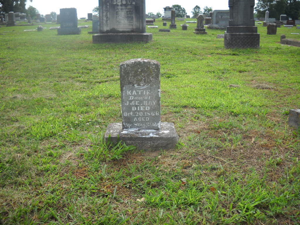 | RAY, Katie | Abt. 1863 | Oct. 20, 1866 | Inscription: "Katie - Dau. of J. and E. Ray - Aged 2 Yrs. 8 Ms. 25 Ds." - Research Note: Daughter of Dr. John Ray and Elizabeth Means. | Note Phyllis Long Photo BCG and HS |
