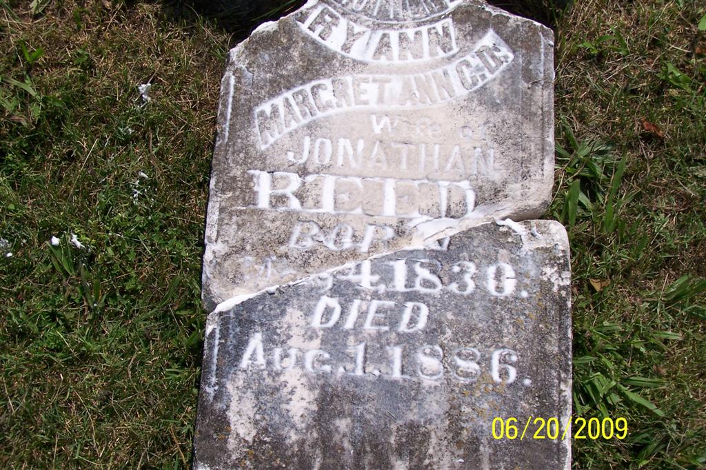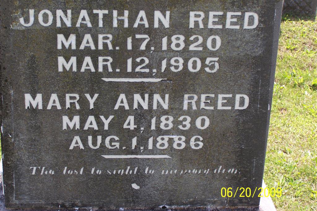 Aug. 1, 1886 | SSW: Jonathan - Inscription: "Wife of Jonathan Reed" - Research Note: The older stone has the same dates with "Mary Ann, wife of Jonathan, with Margret Ann C. D." on it. - REED, Margaret Ann C. D. | Photos BCG and HS |