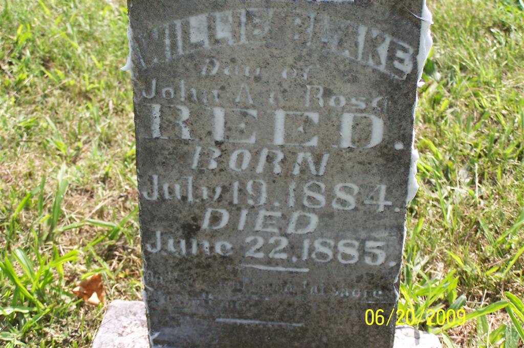 | REED, Willie Blake | July 19, 1884 | June 22, 1885 | Inscription: "Dau. of John A. and Rose Reed" - Research Note: Daughter of John Anderson Reed and Rosaltha Adline Twillinigear. | Note Phyllis Long Photo BCG and HS |