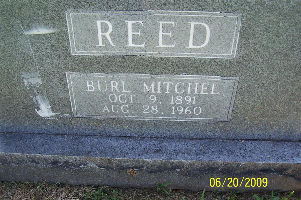 Research Note: He was a son of Samuel A. Reed, born KY and Martha Elizabeth Bayless, born Barry Co., MO and was a Barry Co. Deputy Sheriff. He was a twin to Earl Bayless Reed. Burl M. Reed, age 23, married first married Clara Hemphill, age 19, on Nov. 5, 1914 in Barry Co., MO. 1910 census, Barry Co., MO he is at home with parents. 1920, Barry Co., he is married to Clara. 1930 census, there is a Burl M. Reed, prisoner at the MO State Penitentiary, Jefferson City, MO, divorced, born MO, father born KY, mother born MO. 1940 census, Barry Co., MO, his wife is Lottie with his mother Martha. Lottie is named as Lottie Sanders on their daughter's (Lura E. Reed) death certificate. In 1960 a stone was purchased for his grave by Virginia Reed from the Cassville Monument Co. Virginia Reed of Cassville signed for it. Boot Leg Liquor poisoning was the cause of death. - November 12, 1914, Thursday, Cassville Republican - Married Thursday Evening: Burl Reed of near town and Miss Flora Hemphill of this city were married Thursday evening by Rev. J. T. Brattin at his home. The bride is a daughter of Ira Hemphill of near McDowell. - Cassville Republican, Thursday, Feb. 13, 1919 - Burl Reed appointed supt. of Co. farm for term of one year. - Another Photo | Photos BCG and HS Note Patsy Burch Family knowledge Judy Wilson Cassville Monument Donna Cooper Death Certificate MO Marriage Records Census Phyllis Long |