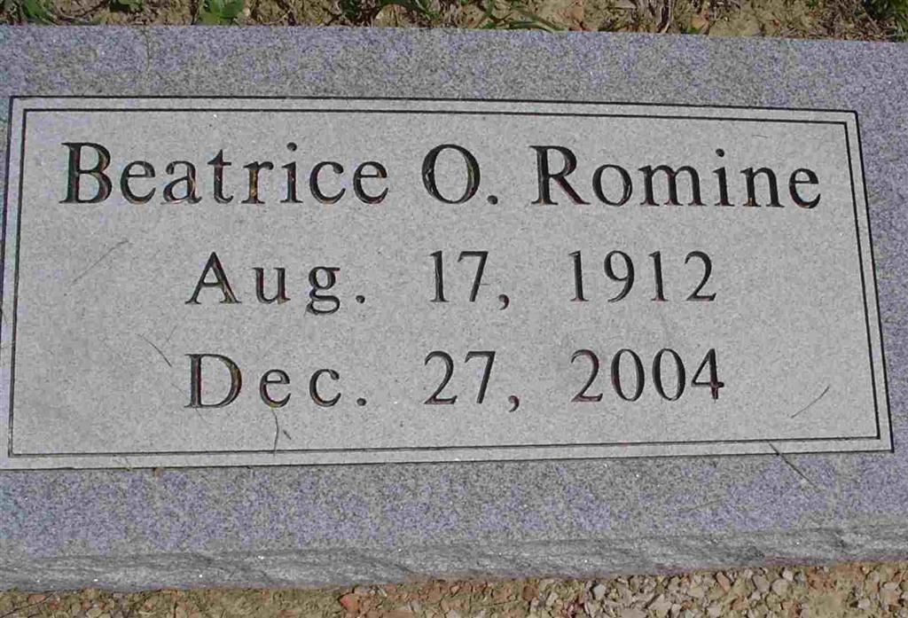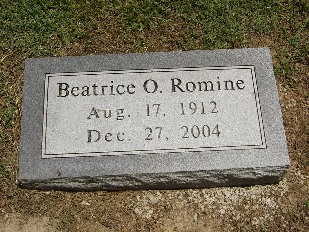 Dec. 27, 2004 | Research Note: Daughter of Joseph Washington and Ester (Braught) Robison. Vernon E. Stubblefield, age 23, married Beatrice H. Robison on Feb. 6, 1932 in Delaware Co., OK. - Graveside services for Beatrice O. Romine, who died December 27, will be 11 a.m. Saturday, May 21, at Oak Hill Cemetery in Cassville with Dean Flanner, pastor, officiating, under the direction of Fohn Funeral Home-Williamson Chapel in Cassville. - Another Photo | Monett Times May 18, 2005 Joy Guentert Photo Donna Cooper Monett Times SS Claims Index OK Marriage Index Phyllis Long Photo BCG and HS |