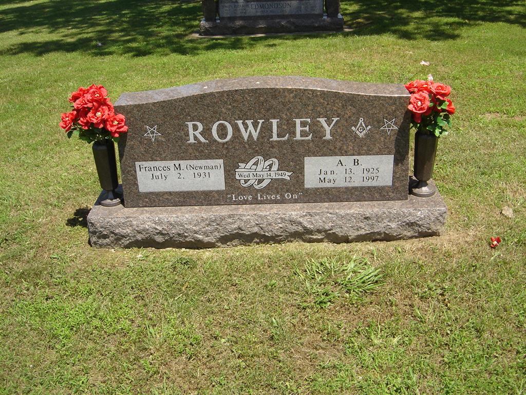 SSW: A. B. - Inscription: "Wed May 14, 1949" - Research Note: She was the daughter of Roy Chuck and Edith Fay (Garner) Newman. She was raised at Cassville and graduated from Cassville High School. She married A.B. Rowley on May 14, 1949, at Berryville, Ark. He preceded her in death on May 12, 1997. She had lived in Oklahoma since 1955. | Monett Times Phyllis Long Photo BCG and HS |