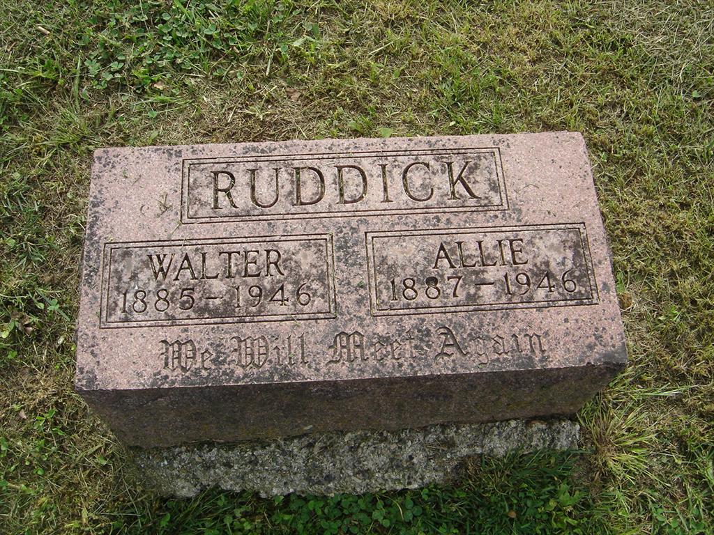 SSW: Allie - Research Note: His stone has his birth year as 1885 and the death certificate has 1888. The cause of death was burned beyond recognition in a residence fire. Note says that the "investigation is being continued". Son of James F. Ruddick and mother not named on the death certificate. Mrs. Delmar Reed of Cassville, was the informant. His mother was Nancy Arnhart. His first wife was Lula E. Beck, died in 1913 due to childbirth and buried with their infant daughter in Horner Cemetery. - December 29, 1906, Saturday, Cassville Democrat - Walter Hisaw and wife of Capps creek township, visited Mrs. Hisaw's parents, J. F. Ruddick and family, northwest of town this week. - July 20, 1916, Thursday, Cassville Republican - Amanda Ruddick vs. Walter Ruddick, divorce decree for plaintiff. - November 9, 1916, Thursday, Cassville Republican - Licenses to Wed: Walter Ruddick, 32, Cassville and Allie Priest, 20 Cassville | Death Certificate Online Newspapers Phyllis Long Photo BCG and HS |