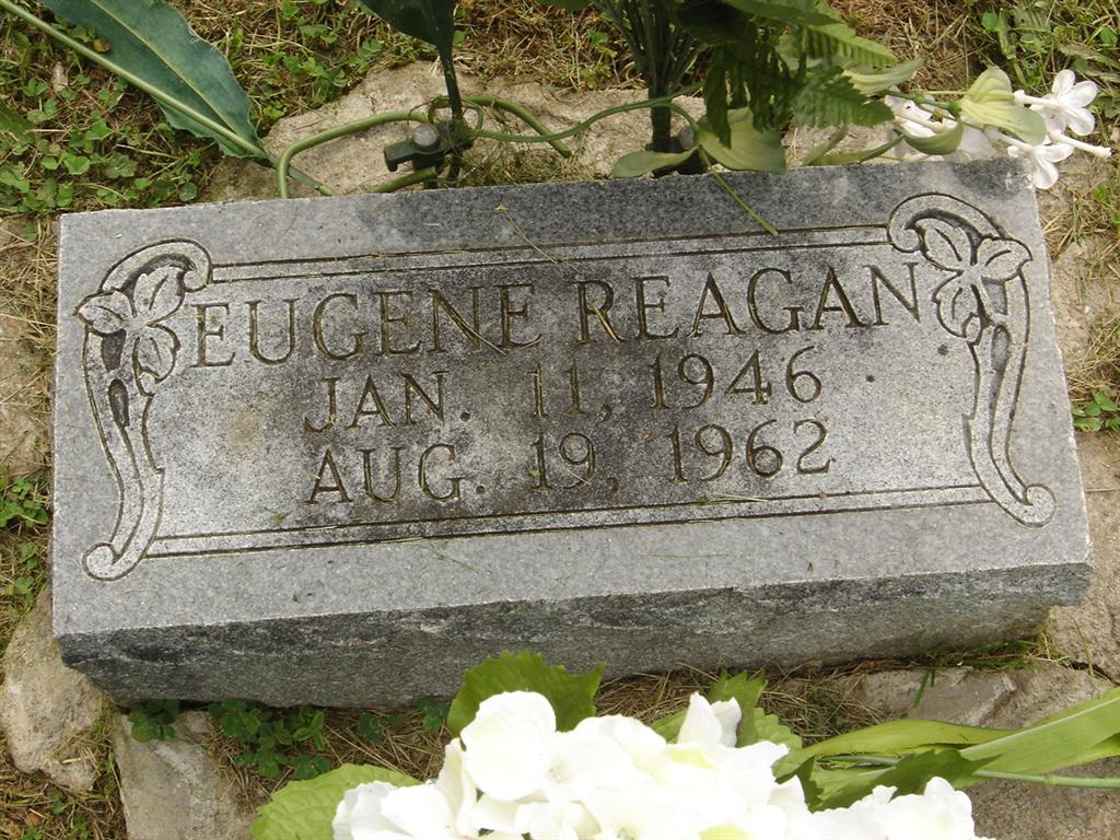 Research Note: According to Culver's Funeral Home records his father was William E. Reagan and his mother Viola Bowman. The caused of death was a crushed skull. He was a school boy, age 16, and Mrs. Ray (Viola) Timmons was his closest relative. In 1965 Cassville Monument set a stone at Eugene's grave and Mrs. Viola Timmons signed for it. - He was riding a motor bike west on Hwy 86, 2 miles South of Cassville, MO and was hit from behind by a car. Lonnie Reagan of Cassville, MO was the informant on the death certificate. | Photo BCG and HS Culver Funeral Home, V.10, P. 41, by Ted Roller Cassville Monument Donna Cooper Death Certificate Phyllis Long |
