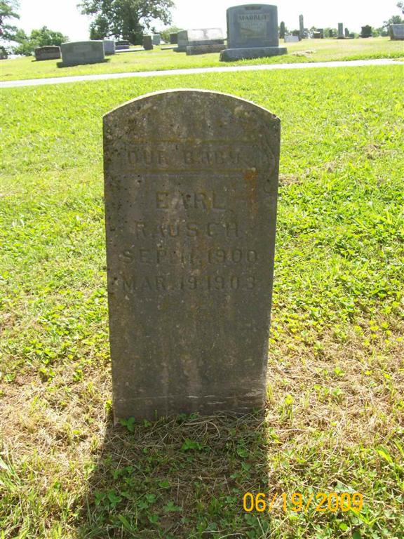 | RAUSCH, Earl | Sept. 11, 1900 | Mar. 19, 1903 | Inscription: "Our Baby" | Photo BCG and HS |