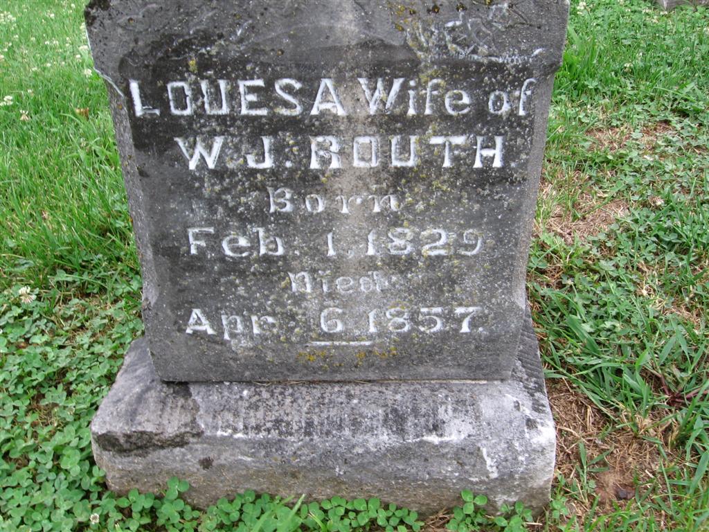 Inscription: "Louesa wife of W. J. Routh" - Research Note: Daughter of Littleberry Mason and Nancy Durham. Wife of William Jacob Routh. Louesa Mason married William J. Routh on Mar. 15, 1844 in Barry Co., MO. | MO Marriage Records Phyllis Long Photo BCG and HS |