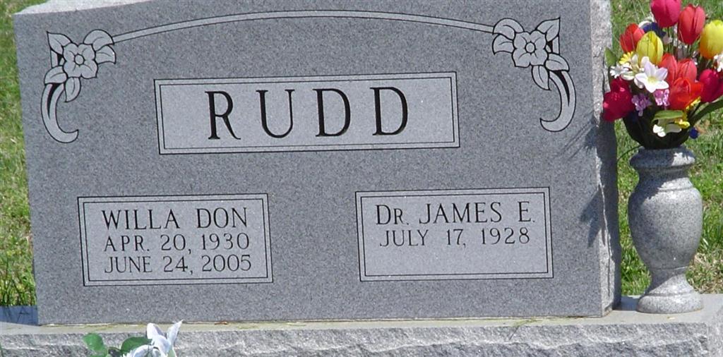 SSW: Willa Don - Research Note: Son of Ward H. and Pauline (Cushman) Rudd. Married Willa Don Graves on June 3, 1956 at the South Joplin Christian Church. Dr. Rudd received his elementary education in Winfield, KS and graduated from Neosho High School. He attended Central College (now Central Methodist University), The University of Arkansas, and graduated from Southern College of Optometry in Memphis, Tennessee, then served two years in the military. He practiced Optometry in Cassville, Neosho, and Shell Knob, MO. He was a member of the Neosho United Methodist Church, The Southwest Missouri Optometric Society, and The Missouri Optometric Association, of which he was a past president. Preceding Jim in death were his parents, his wife of 49 years, Willa Don, two daughters; Robin Sue and Rose Ann, and one son; Ward Douglas. | Clark Funeral Home Phyllis Long Photo Donna Cooper Photo BCG and HS |