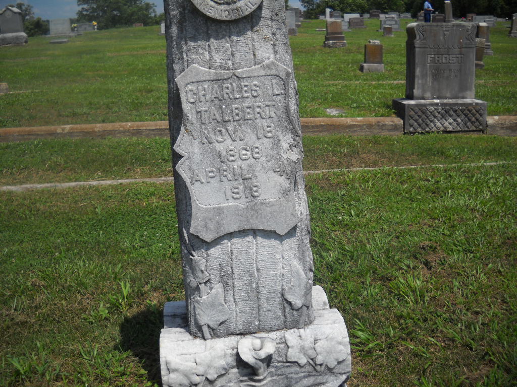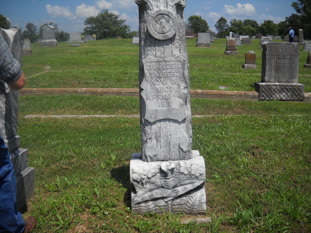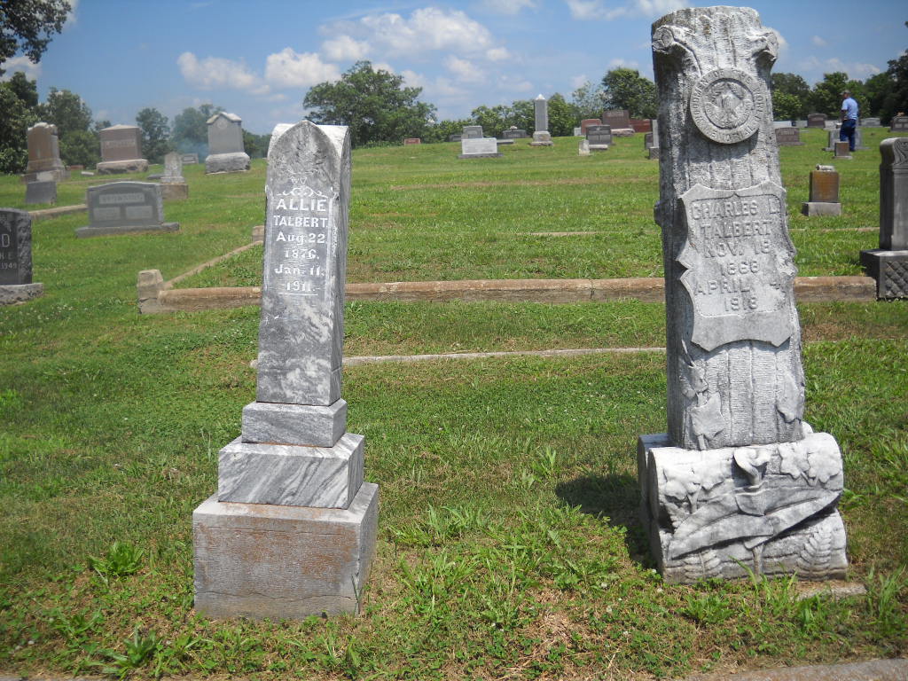Research Note: Woodmen of the World emblem on his stone. His parents are marked unknown on his death certificate by the informant. Son of Alpheus Talbert and Eliza Carter. - Cassville Republican, Thursday, April 11, 1918 - The funeral of Charles L. Talbert was held in this city Sunday afternoon from the Christian church and interment made in Oak Hill cemetery. The services at the church were conducted by Eld. J. S. McQueen. The M. W. A. and the W. O. W. fraternal orders gave their funeral ceremonies at the grave. Charles L. Talbert died at Nevada, Thursday, April 4. His body was brought in Cassville, Saturday morning and taken to the home of Mr. and Mrs. B. F. Johnson. He had been at Nevada for treatment for about two years. Charles was a son of the late Alpheus Talbert who came to this county about forty years ago from Indiana and located northeast of Cassville on Flat Creek and engaged in farming and milling. There Charles grew to manhood and had lived nearly all the remainder of his life in the vicinity of Cassville. He was a mechanic by trade and followed that business in Cassville for a number of years. A short time before he lost his health he built the West Side garage which he continued to own at the time of his death. He was twice married. His first wife was Miss Allie Gaskins who died several years ago. By this marriage there are two living children, Miss Charlie and Jackie, both of whom attended the funeral. His second marriage was to Miss Maud Sherrick of Aurora who with one child also survive him. Charles Talbert had always borne the reputation of being an honest, industrious man. He was of a pleasant disposition and always so congenial that he made friends of everybody. - April 20, 1916, Thursday, Cassville Republican - Personal and Local News: Charles Talbert of Aurora, formerly of this city, was adjudged insane by the county court at Mt. Vernon at its session last week. He has been taken to the asylum at Nevada for treatment. - Another Photo - Another Photo | Online Obit Death Certificate Online Newspapers Census Phyllis Long Photos BCG and HS |