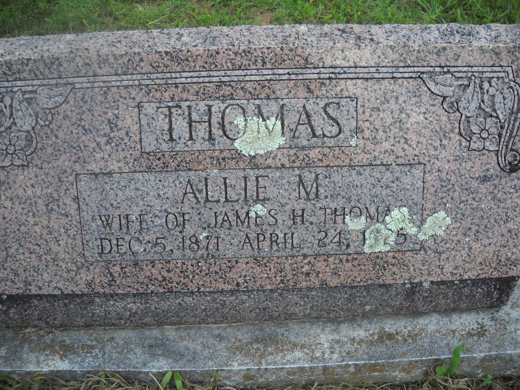 Inscription: "Wife of James H." - Research Note: According to her death certificate she was a Cassville resident and the first wife of James Henry Thomas. She was a daughter of M. A. and Sarah J. Galloway. - March 25, 1897, Cassville Republican - Licensed to Wed: James H. Thomas, 23, Jenkins and Allie M. Galloway, 24, Jenkins. - October 16, 1913, Thursday, Cassville Republican - Chas. Galloway of Lamar visited his brother, A. L. Galloway, and sister, Mrs. J. H. Thomas and families Sunday and Monday. - Parents Golden Wedding Anniversary - Mother's Obit - Father's Obit | Death Certificate Online Newspapers Phyllis Long Photo BCG and HS |