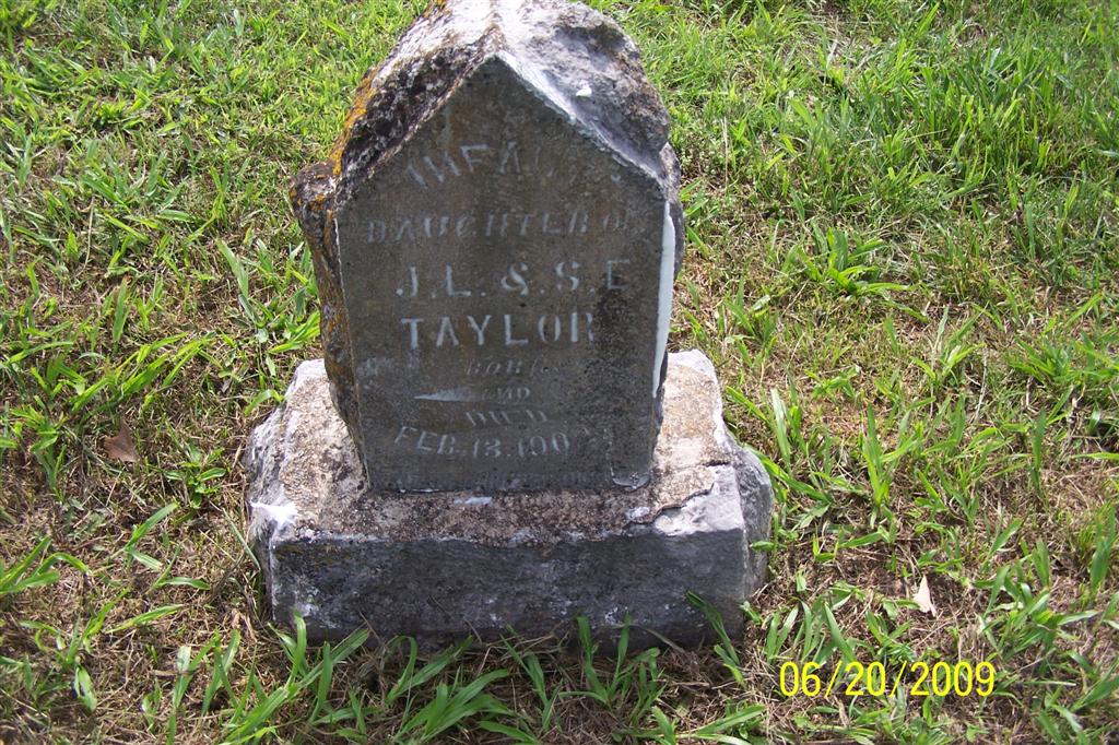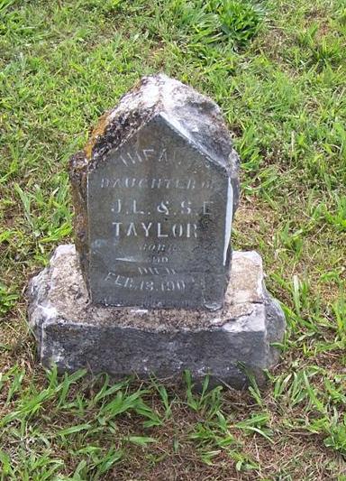 | TAYLOR, Infant | Feb. 13, 1902 | Feb. 13, 1902 | Inscription: "Infant Daughter of J. L. and S. E. Taylor" - Research Note: This child is buried near the Lee graves. - Another Photo | Photos BCG and HS |