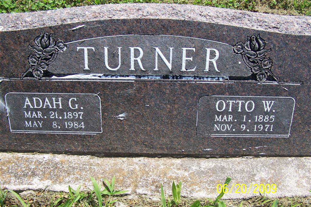 | TURNER, Adah G. (JAQUES) (PACKWOOD) | Mar. 21, 1897 | May 8, 1984 | SSW: Otto W. - Research Note: Her son's death certificate reads that her maiden name was Jaques. Daughter of Daniel S. Jaques and Jane Sevenia Tyler. - She was the second wife of Otto W. Turner and a daughter of Daniel S. Jaques, born Switzerland and Savena Tyler, born Maryland according to researcher Ron Reid. She first married Otis Packwood. Adah Packwood second married Otto H. Turner on Mar. 8, 1922 in Carthage, Jasper Co., MO. - Otis Obit: Wheaton Journal, June 18, 1920 - Dies at Minnesota Hospital - Relatives of Otis Packwood received a telegram this morning stating that he had died late Thursday evening at a hospital in Rochester, Minnesota where he had gone a short time ago for an operation. The deceased was somewhere near 28 years of age and for years has been one of the successful school teachers of Barry County. He taught during this past term at the Oklahoma school a few miles southeast of here. The body will be shipped back for burial. He was the son of Napoleon B. and Sarah A. (Weatherly) Packwood. | MO Marriage Records Census Obit Phyllis Long Photo BCG and HS |