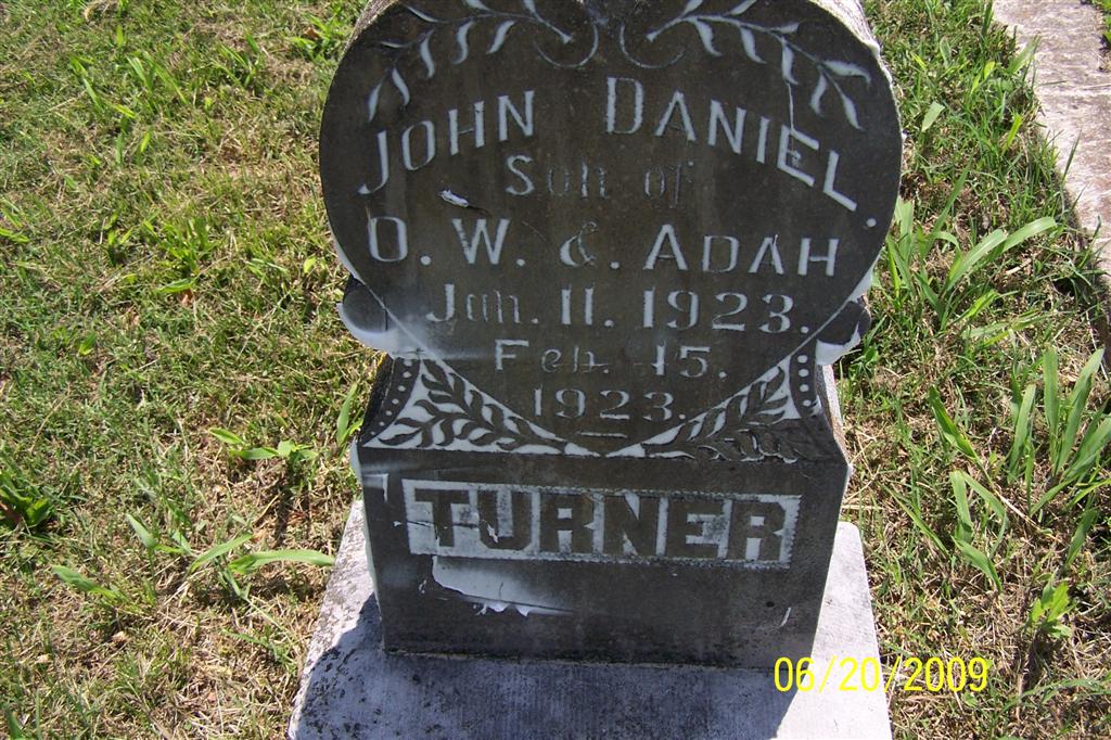 Inscription: "Son of O. W. and Adah" - Research Note: His death certificate reads that his father was Otto W. Turner, born Shelby Co., IL, and that his mother was Adah G. Jaques, born Barry Co., MO, and this infant was 1 month and 4 days old when he died. The cause of death was convulsions. | Death Certificate Donna Cooper Photo BCG and HS |