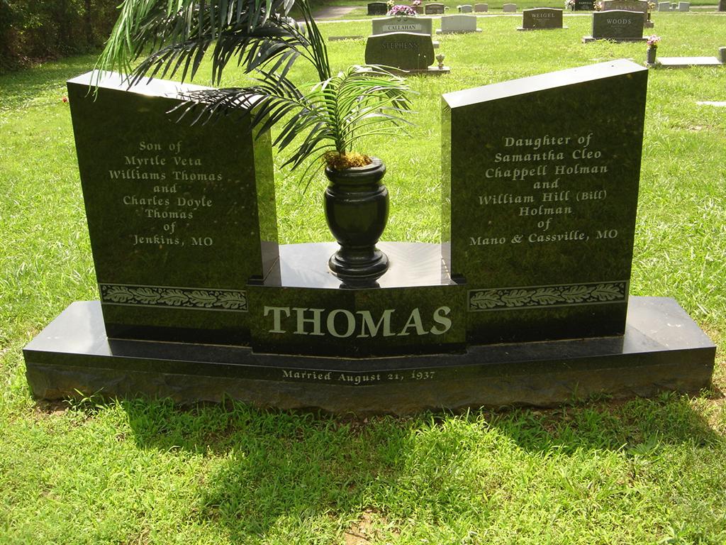 Sept. 22, 1978 | SSW: Eunice Holman - Inscription: "Married August 21, 1937" - "Son of Myrtle Veta Williams Thomas and Charles Doyle Thomas of Jenkins, MO" - Back of Stone | Photos BCG and HS |