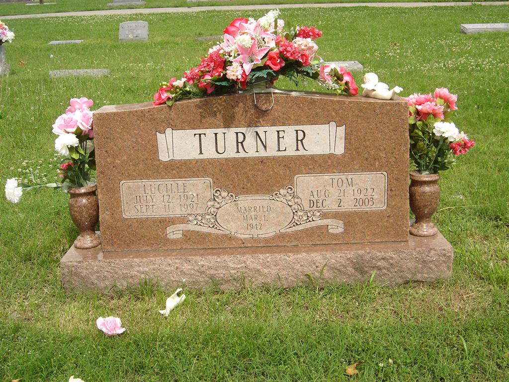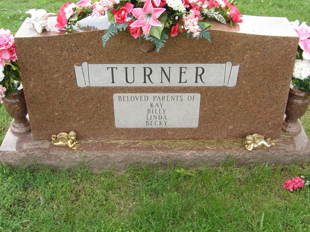 SSW: Lucille - Inscription: "Married Mar. 1, 1942" - Inscription on Back: "Beloved Parents of KAY, BILLY, LINDA, BECKY" - Research Note: He was a son of Franklin Theodore and Delilah Francis (Knee) Turner. He was a lineman for Barry Electric for many years. He was an Army veteran of World War II. He married Reba Lucille Coones on March 1, 1942, and she preceded him in death September 11, 1997. - Back of Stone | Monett Times Dec. 2003 Phyllis Long Photo BCG and HS |