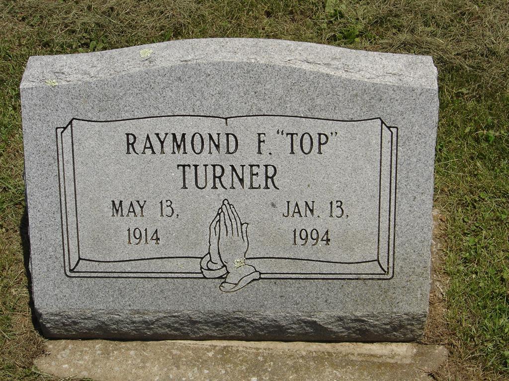 | TURNER, Raymond F. "Top" | May 13, 1914 | Jan. 13, 1994 | Research Note: Raymond "Top" Turner was a son of Frank Turner and Delilah Knee. The family story is that because he was tall and could be seen in a crowd towering above the others in a group that they called him Top. | Note Donna Cooper Photo BCG and HS |
