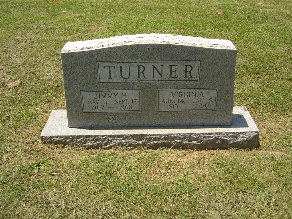 SSW: Virginia - Research Note: He has a Masonic emblem on his stone. Culver Funeral Home Records, pub. by Ted Roller, state that his father was James P. Turner and his mother Annie Brown. His wife's name was Virginia Pearl Turner, and they lived at 604 W. First St., Cassville, MO. He was a farmer and had lived a life time in the area. | Culver Funeral Home, V. 13, by Ted Roller Donna Cooper Death Certificate Phyllis Long Photo BCG and HS |