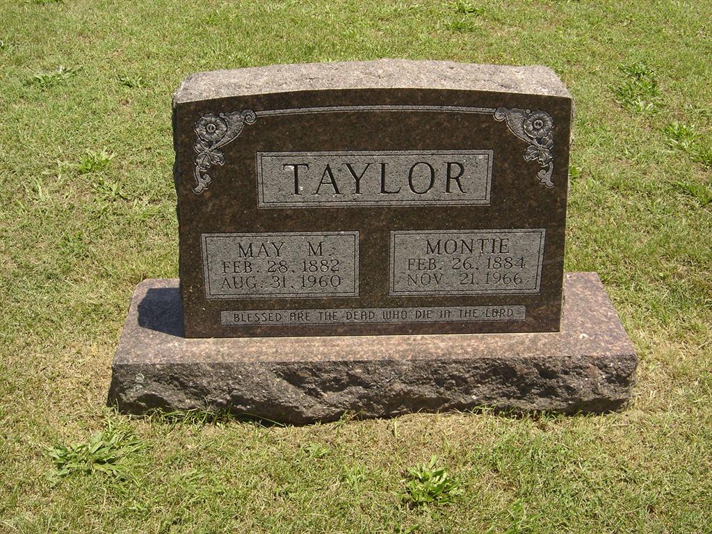 SSW: May M. - Research Note: Winfield Scott and Louisiana Ellen (Banks) Taylor were his parents. His name was George Montie. He married May Gemmecke in Barry County on Feb. of 1916. Culver Funeral Home records have his name as Monty and the stone reads Montie. Mrs. Ruth Putcamp of Fresno, CA wa the informant on the death certificate. - April 28, 1910, Thursday, Cassville Republican - White Church News: Montie Taylor went to Joplin Monday from there he intends to go to Kansas. - May 12, 1910, Thursday, Cassville Republican - White Church News: Montie Taylor came home from Joplin to see his mother who has been ill. - Cassville Republican, Thursday, Oct. 23, 1919 - White Church: Rev. Montie Taylor of Seligman visited his parents Sunday. | Culver Funeral Home, V. 12, P. 76, by Ted Roller Donna Cooper Online Newspapers Death Certificate Phyllis Long Photo BCG and HS |