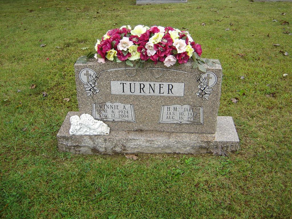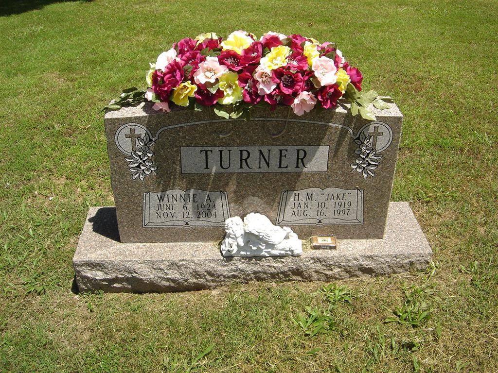 SSW: H. M. "Jake" - Research Note: Daughter of William Sam and Winnie Belle (Bilyeu) Lawrence, married H. M. "Jake" Turner on August 17, 1940, in Clovis, New Mexico, and he preceded her in death August 16, 1997. - Back of Stone - Another Photo | Monett Times Nov. 15, 2004 Mary Homesley Photos BCG and HS |