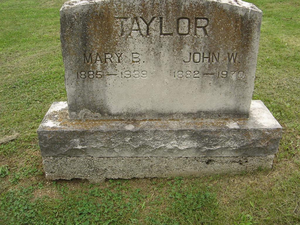 SSW: John W. - Research Note: Mary has a homemade stone - and a newer stone, too. Mary Belle was married to John W. Taylor and was age 54 years, 2 months and 9 days old when she died. Rueben Starkey, born IA, was her father and her mother was Mary E. Smith, born IA. John W. Taylor, Cassville, MO, was the informant. - Old Stone | Death Certificate Donna Cooper Photo BCG and HS |