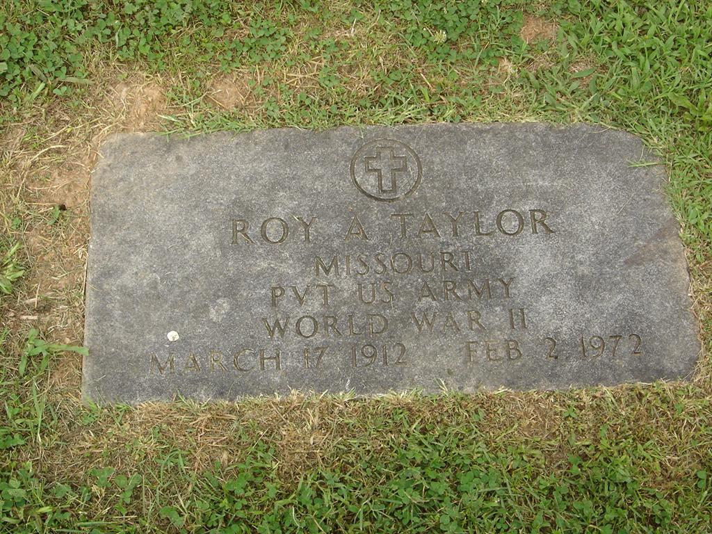 Research Note: Culver Funeral Home records state that his father was John W. Taylor and his mother Mary Belle Starkey. Myrtle Black, Monett, MO, was his sister and he was a construction worker. He was divorced. Wife might have been Ruth Kittel. - Military Stone - Inscription: "ROY A. TAYLOR - MISSOURI - PVT US ARMY - WORLD WAR II" | Culver Funeral Home, V. 15, P. 4, by Ted Roller Donna Cooper Photos BCG and HS |