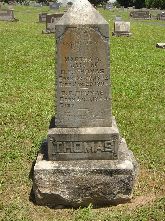 SSW: Martha A. - Research Note: Son of Nathan Solomon Thomas and Epsy Jagger. During the Civil War he enlisted in Co. L of the 1st Ark., Cav., and served four years. - September 9, 1915, Cassville Republican, Barry Co., MO - Barry County Citizen Dies Suddenly at Home Near Powell: Daniel F. Thomas died at his home 3 miles southeast of Powell, McDonald County, Wednesday, Sept. 1 of apoplexy, age 71 years. Mr. Thomas and son, Ed, were in Cassville the week before and were considering a deal for property in Cassville. At that time he appeared to be in good health and on the day of his death he had stated that he was feeling well. His sudden death was caused by apoplexy. His complaint about a severe pain in his arm was the only warning his family had that anything was wrong. Lying down on a couch for a short time just before noon Wednesday, he soon passed quietly away. Daniel F. Thomas was born in Tennessee, Aug. 1, 1834. When only two years old his parents moved to this state. He lived most of his life in Lawrence and Barry Counties. during the Civil War he enlisted in Co. L of the 1st Ark., Cav., and served four years. He was married to Miss Martha A. Thornton in 1864. Thirteen children were born to them, seven of who are now living. Mrs. Thomas died in 1903 and Daniel second married in 1910 to Mrs. Lizzie Lee of Rogers, Ark., who is living. The children living are: Nathan of Verona, Oscar of Monett, Frank, Edward and Charles and Mrs. Laura Sparks, Mrs. Ann Peters and Miss May Thomas of McDonald County. He lost his eye sight in 1868. For a number of years he lived northeast of Cassville one mile on Flat Creek and with his sons operated a small mill. He was a member of the Baptist Church and a good citizen. His body was brought to this city, Thursday. The funeral was held from the Baptist Church, conducted by Revs. Lamb and Ennis. Interment was made at Oak Hill cemetery. - March 4, 1897, Cassville Republican - D. F. Thomas' saw mill has been moved to the picnic ground on the Galena road. | Online Newspapers Census Phyllis Long Photo BCG and HS |