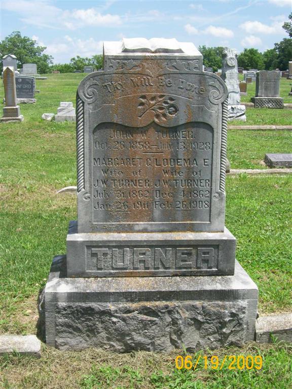 SSW: John W. and Margaret C. - Inscription: "Wife of J. W. Turner" - Research Note: Daughter of Noah Syfert and Katherine Frisner. First wife of John W. Turner. Lodema Ellen Syfert married John William Turner on Feb. 10, 1881 in Shelby Co., IL. - March 14, 1908, Saturday, Cassville Democrat - Mrs. J. W. Turner who died last week, was a member of the Court of Honor Society and carried $1,000 insurance for benefit of her husband. | Online Newspapers IL Marriage Index Census Phyllis Long Photo BCG and HS |