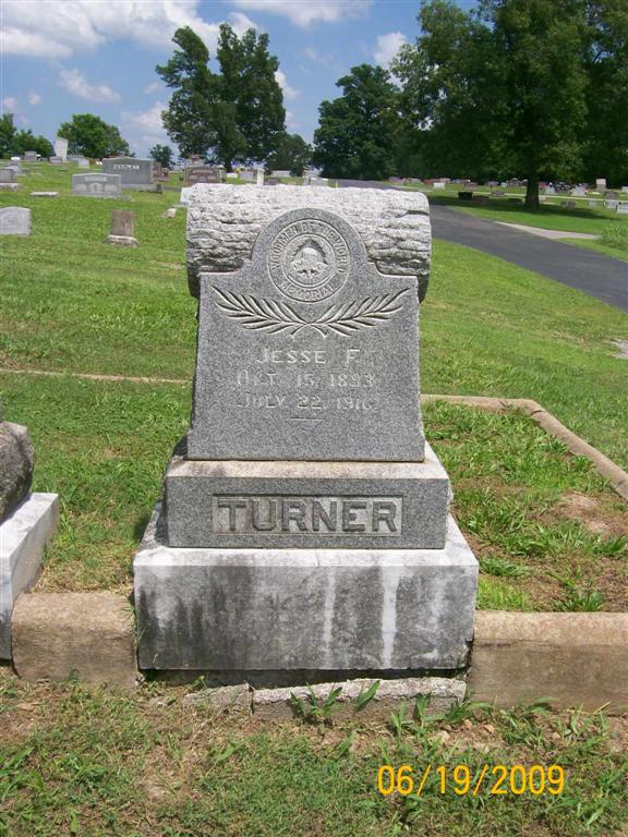 Research Note: He has a Woodmen of the World Memorial on his stone. According to his death certificate he was a son of George A. Turner and mother's maiden name was Starns (Eliza Ann Starns). Father of Jesse Franklin Turner who was murdered in Joplin, MO., Clyde W., and four daughters, Gertrude, Gladys, Nadine, and Marie. He was the husband of Leola N. (Day) Turner. | Death Certificate Census Phyllis Long Photo BCG and HS |