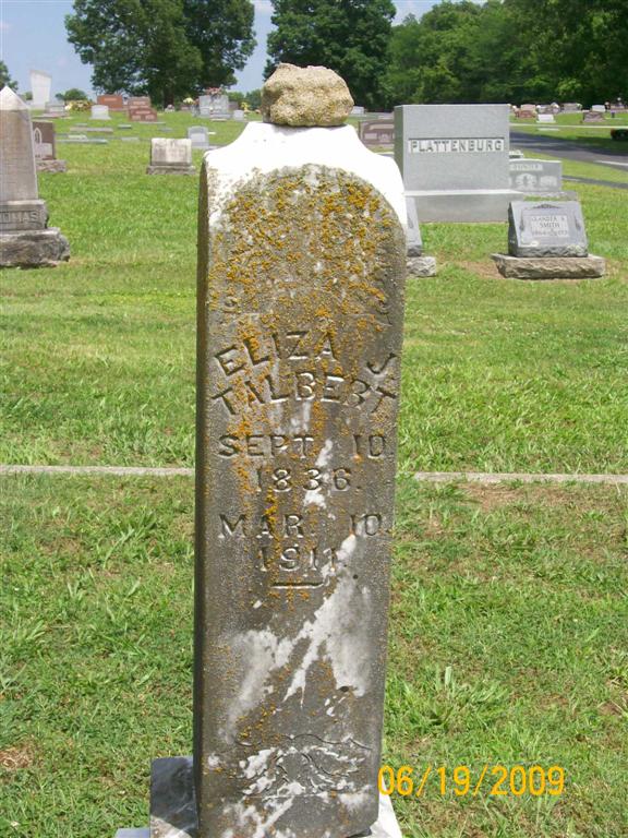 Research Note: On the death certificate the father is given as Landon Carter, born NC, hard to read. The mother not given. Her mother was Nancy M. Vaughn. Eliza Jane Carter married Alpheus Talbert on Dec. 22, 1855 in IN. - Mar. 16, 1911, Thursday, Cassville Republican - Mrs. Eliza Talbert passed from time to eternity at the home of her son C. C. Talbert on West Spring Street Friday morning, March 10, 1911. Mrs. Talbert had been a woman of a remarkably strong constitution and even after she had passed her allotted three score and ten, was the equal in strength of most women of fifty. Several months ago her health began to fail rapidly from a stomach trouble from which she could get no permanent relief on account of her advanced age. She had since gradually given away until death relived her suffering. Eliza Talbert was born in Shelby County, Indiana, September 10, 1836. She was married to Alpheus Talbert, December 27, 1855. They moved to Barry County in 1878 and located four miles north of Cassville on Flat Creek where they lived. Mr. Talbert died a number of years ago. The family continued to live there for several years, and the farm still goes by the Talbert farm. Mrs. Talbert has for some time owned property in Cassville where she has lived since leaving the farm. She leaves two sons, W. R. Talbert of Omaha, Neb., and C. L. Talbert of this city, and three daughters, Mrs. Anna Wilcox of Settle, Wash., Mrs. Hattie Pate of Sunrise, Okla., and Mrs. Corda Lamar of Washburn. In her religious belief she favored the Methodists and her funeral was preached by Rev. J. W. Ennes, at the Christian Church in this city, Sunday afternoon, and the body laid to rest in Oak Hill Cemetery. Mrs. Talbert was a frank, plain spoken woman and always cheerful disposition, never looking on the dark side of things but meeting all difficulties and hardships when they chanced to come with a smile. Her indomitable will power and jovial and accommodating manner, were strong attributes of her character and made her lasting friends as her years passed by. - April 13, 1911, Thursday, Cassville Republican, Barry Co., MO. The body of Mrs. Eliza Talbert was exhumed Monday and placed in another part of Oak Hill Cemetery. The bodies of her husband, Alpheus Talbert and a son were exhumed at the Quaker Cemetery Tuesday and removed to Oak Hill Cemetery where they were placed in the same lot with the body of Aunt Eliza. | Online Obit Death Certificate Census IN Marriage Records Phyllis Long Photo BCG and HS |