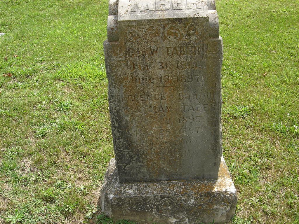 | TABER, George W. | Jan. 31, 1861 | June 13, 1897 | SSW: Florence - Research Note: George W. Taber married May Livingston on July 3, 1889 in Cassville, Barry Co., MO. May Tabor, age 32, married Edward B. Dunkeson, age 32, on June 20, 1900 in Cassville, Barry Co., MO. May died in 1952 and is buried at Lincoln Center Cemetery, Hatfield, Harrison Co., MO. - Jan. 28, 1892, Thursday, Cassville Republican - Shell Knob News: George Tabor has recovered so much as to be taken home from his father's. | MO Marriage Records Online Newspapers Phyllis Long Photo BCG and HS |