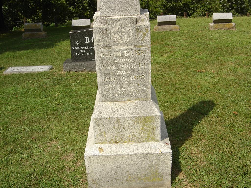 Research Note: Civil War Veteran. Co. C., 113th Ind. Inf. William Talbert first married Amanda Carter on Sept. 1, 1866 in Shelby Co., IN. Amanda died in 1878 and is buried at Pierce City Cemetery, Pierce City, Lawrence Co., MO. His second wife was Dora Hawk. - Cassville Republican, Thursday, July 18, 1895 - Died, Monday, July 15, 1895, at 7:35 p.m. William Talbert was born in Shelby County, Ind., June 29, 1844, where he grew to manhood. In 1863, he enlisted in Co., C., 113th Ind., Inf. from which he was honorably discharged. Removing to this place in 1875, he was a resident until his deceased except during 1876, which was spent in Indiana. During the life here he always took an active part in all public enterprises and aided them for the benefit of the town and county. Last year he was elected to the office of Recorder of Deeds of Barry County, a position of rust and honor that is left vacant. Funeral services were held by Rev. J. W. Koons, of Exeter, after which the remains were interred in the Cassville Cemetery. The interment was conducted by the Mason of which order he was an active and leading member. - Photo of William - Another Photo | Online Obit Darla Marbut Civil War Page Phyllis Long Photo BCG and HS |