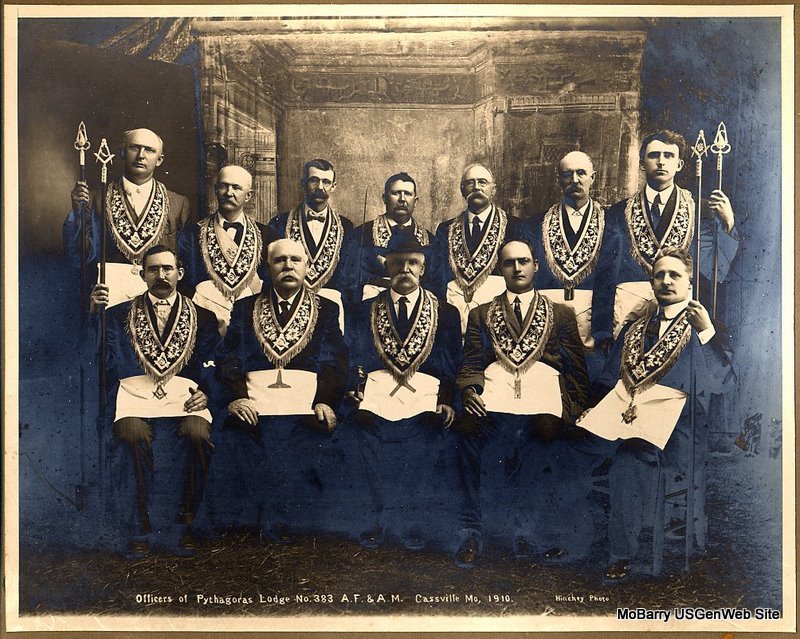 Pythagoras Lodge - No. 383, AF & AM - Cassville, MO, 1910 - A Hinckey Photo Here is a listing of the people who are pictured below in the photo. This information is not from my original picture (which seems not to be anywhere) but from a newspaper article in July 1977. I am listing the names as they occurred in the article: "This 1910 picture of the officers of Pythagoras Lodge No 383, A. F. & A.M., of Cassville, includes many of the area's leading citizens of the time, names which are familiar in the area 67 years later. Pictured [l. to r.] Front row: Monroe Black, R. G. Salyer, Samson Cozad, unidentified, and Dr. O. H. Thiele. Back row: Dr. W. T. Bailey, Charley Ray, Simp Frost, Jefferson J. Eden (L. Moore note - it should be James Jefferson Edens), J. S. Plattenburg, Hiram P. Sons, and Bert Robbins." Research note: I still have Grandpa Edens' "apron" or whatever it is called. There were other items related to his service in this organization but one of mother's cousins took them. James Jefferson Edens was my great grandfather LoVella Moore Left to right - front row - is the Junior Deacon, Senior Warden, Master (in the hat), Junior Warden and Senior Deacon. Stewards (with identical cornucopia emblems topping their rods) stand at each end of the back row. The heavy set man in the middle - back row - is James Jefferson Edens, he was the great grandfather of of LoVella Moore Here is a listing of some people who might be pictured in the photo. In 1902 Capt. Livingston, was master of the lodge. On the back row, 5th from the left, could be Evan Shore? Michael Horine was a member and he was in the abstract office in 1910 - information from obit and census. Anson Harrell, died 1918 - was a member - information from obit. John Thompson McCary, a member - died 1916 - information from newspaper. These people below were some of the business people in Cassville in 1910, according to the census, and could have been in the lodge. Spellings may vary: Charles Ray, Editor of Democrat, James Black, Bank President, Enard? Mitchell, merchant, Samuel Mitchell, power plant, Newt Hailey, farmer, Alhoure? Hailey, jeweler, Dr. Stephen Newman, Charles Kenneston, eye doctor, Otto Thiele, dentist, John Hisey, photographer, David Dinger, miller, Rufus Salyers, bank president, William Martin, bank, William Priest, agent for railroad, John Langston, postmaster, Author Hawk, miller, Robert Mitchell, merchant, Calvin Hadley, merchant, Marshall Newman, sheriff, John Thompson McCary. Submitted in 2008 by Linda Stephens McCormick |