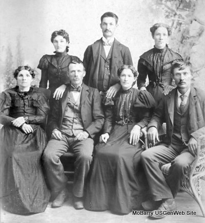 Pictured at left are the children of John Harvey & Achsah (Hobson) Robbins. From left, back row: Mollie (Robbins) Grimes, Benton Robbins, and Vena (Robbins) White. Front row, from left: Ellen (Robbins) Spurgeon, Joe Robbins, Della (Robbins) Gaskins, and Milus Robbins. Submitted by: Norman Smith - Restored Photo by Gary Ball |