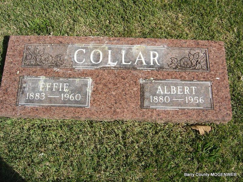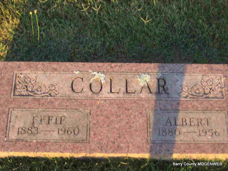 SSW: Effie - Research Note: His death certificate reads that his father was Washington I. Collar and his mother was named America Danna Brock. Effie (Woods) Collar was given as his wife's name and she was the informant on the death certificate. Ida Anne (Woods) Daugherty is buried next to Albert and Effie. - Cassville Democrat, June 19, 1920 - Albert Collar and wife and Monte Collar and Mrs. Frank Marion motored to Aurora, Sunday to see Mrs. Collars brother, who was very sick. - Another Photo | Death Certificate Donna Cooper Online Newspapers SS Claims Index Phyllis Long Photo Elmer Thorn Photo Ted Roller |