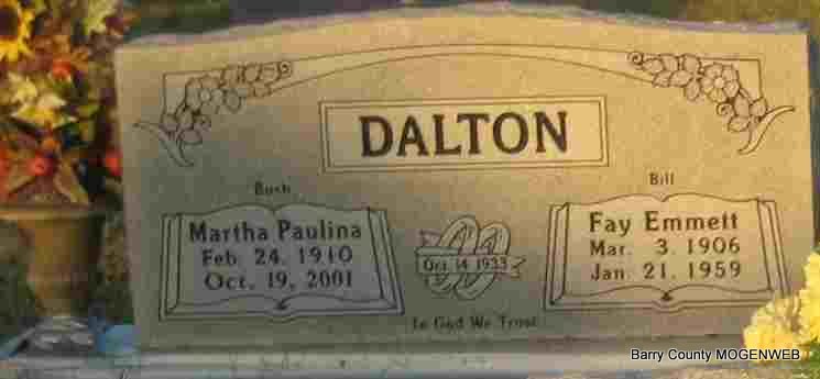 SSW: Fay Emmett "Bill" - Inscription: "Married Oct. 14, 1933" - Research Note: Daughter of Estel and Alta (Hankins) Bush. In Oct. 1933 she was united in marriage to Fay Emmett "Bill" Dalton, who proceeded her in death. She was a homemaker and had lived in Eagle Rock for the past 21 years. She was preceded in death by one daughter, four brothers, and one sister. | Monett Times Oct. 22, 2001 Patricia Ellison Photo Elmer Thorn |
