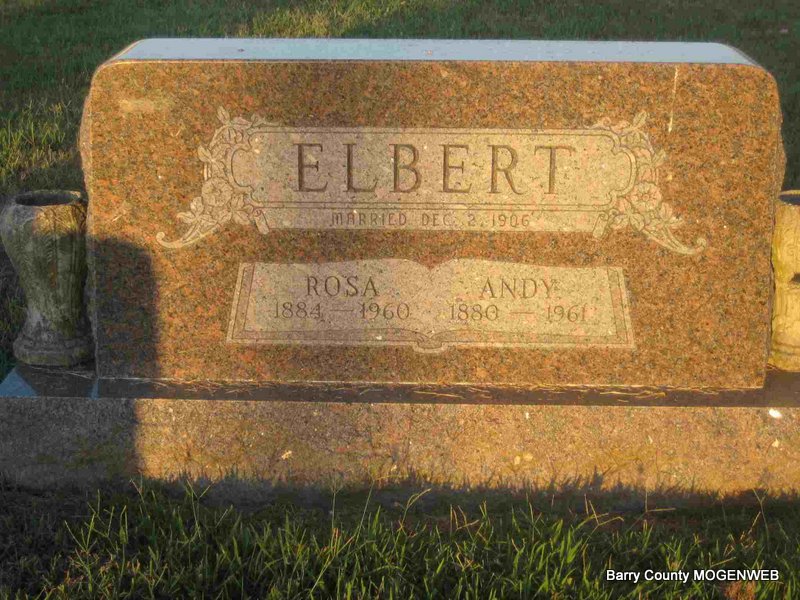 SSW: Andy - Inscription: "Married Dec. 2, 1906" - Research Note: Rosa (Patton) Elbert was the daughter of Light W. and Clara A. (Shears) Patton. Mrs. Walter Allen of Friestatt, MO was the informant on the death certificate. | Death Certificate Phyllis Long Photo Note Elmer Thorn |