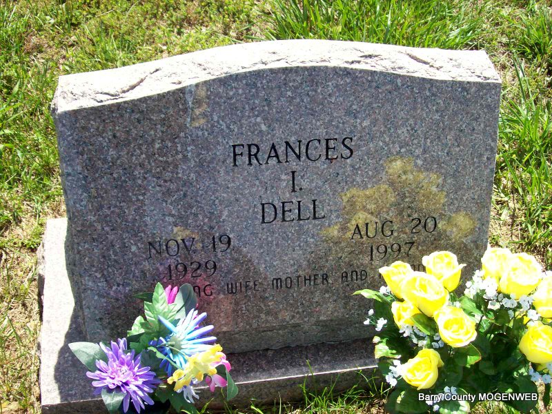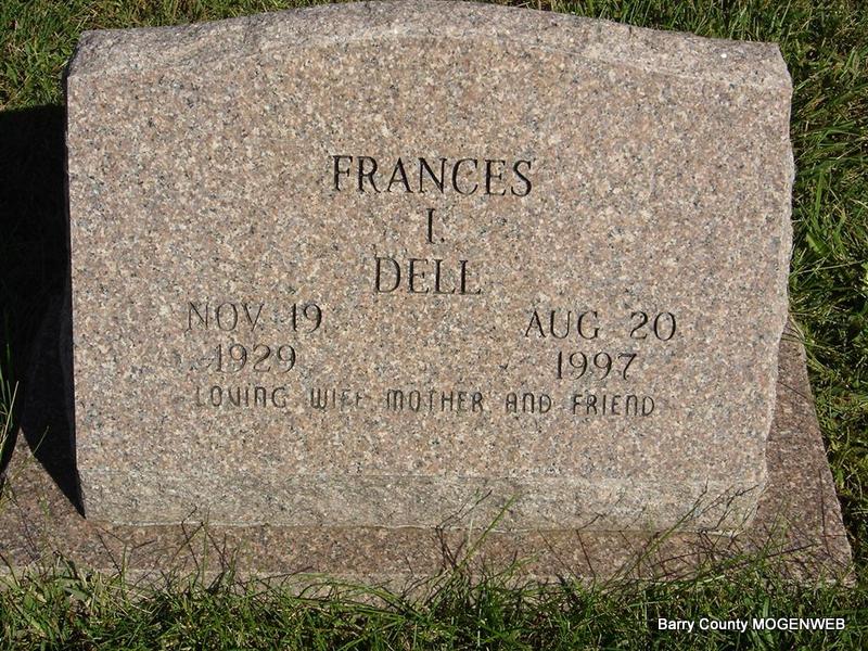 Inscription: "Daughter, Wife, Mother, Grandmother" - Research Note: Daughter of Omar . Neeley and Mary E. Hewig. She received her education in Cheyenne. Her family then moved to Missouri, where she lived most of her life. She was a homemaker and also worked as manager of a restaurant. She attended Corinth Baptist Church, Cassville. She married Rayburn Easley, who preceded her in death. She later married Lloyd Orville Dell on July 19, 1968. He died Feb. 13, 1995. - SS Claims Index: May 1960: Name listed as FRANCES IMOGENE EASLEY; Nov. 1965: Name listed as FRANCES EASLEY KIRKWOOD; May 1972: Name listed as FRANCES DELL; Mar. 1979: Name listed as FRANCES IMOGENE DELL; Sept. 1997: Name listed as FRANCES I. DELL. - Another Photo - Back of Stone | Fohn Funeral Home SS Claims Index Phyllis Long Photo Darla Marbut Photos Ted Roller |