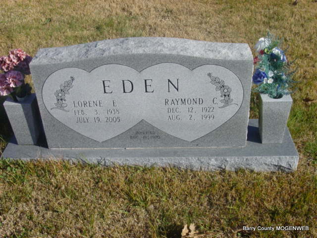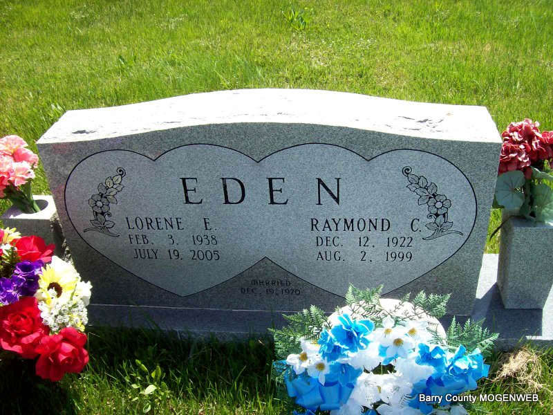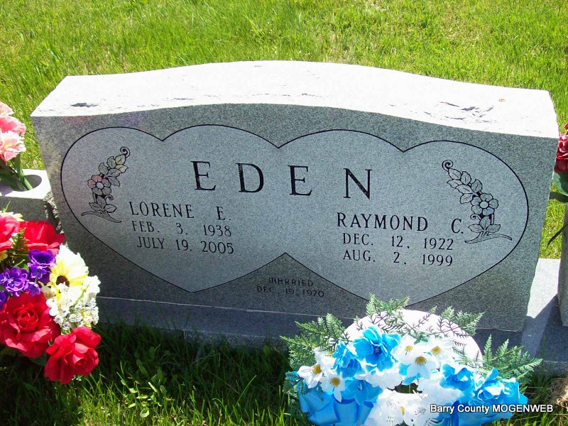 SSW: Lorene E. - Inscription: "Married Dec. 19, 1970" - Research Note: He was a son of Bolin G. and Alice Viola (Carterman) Eden. He married Lorene Simon on December 19, 1970, in Las Vegas, Nevada. He was preceded in death by two daughters Cathy and Donna Eden. - Raymond C. Eden, age 26, married Lucille Turtle, age 22, on Dec. 2, 1949 in Tulsa, OK. - Another Photo - Another Photo - Back of Stone - Military Stone - Inscription: "PFC US ARMY" | Cassville Democrat Aug. 4, 1999 Mary Homesley SS Claims Index OK Marriage Index Photo Phyllis Long Photos Darla Marbut Photos Ted Roller |