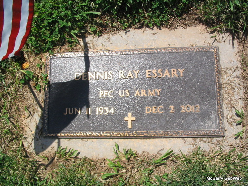 Inscriiption: "PFC US ARMY - Research Note: He was the son of Clarence Efton and Flossie Jewel (Hunter) Essary. On April 26, 1957, at Crane, Missouri, he was united in marriage to Fairy Patton. Dennis was preceded in death by his parents, three brothers, Clovis Essary, Burle Essary and William Essary and six sisters, Alene Rainwater, Marcine Terry, Maxine Eaton, Pauline Friend, Darlene Greenway-Wheeler and Norma Dahms. Dennis grew up in Cape Fair and received his education at Galena, Missouri, where he attended high school. He served his country in the United States Army. Following his service he returned to Southwest Missouri, where he has lived all his life. Dennis was an entertainer and enjoyed playing music and fishing. | Fohn Funeral Home Photo Phyllis Long |