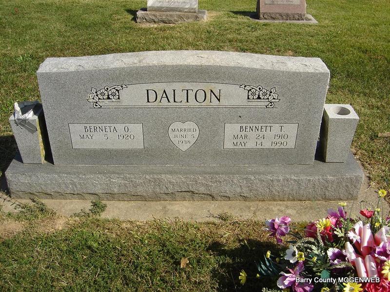 SSW: Bennett T. - Inscription: "Married June 5, 1938" - Research Note: She was a daughter of Ruben and Ida (Shrum) Maloney. Berneta was united in marriage to Bennett Theodore Dalton June 5, 1938 at Oak Ridge in Barry County, Missouri. He preceded her in death May 14, 1990. Berneta received her education at Lone Elm, Cedar Mound and Hailey schools, east of Cassville. She lived in Barry County in the Hailey Community several years, where she and her husband farmed. For over 20 years she and her husband owned and operated Dalton's Bait Station in Cassville, MO. In addition to her husband and parents, she was also preceded in death by a son, Theodore Bennett Dalton; five sisters, Goldie Lester, Jewell Thomas, Rhoda Hilton, Sarah Jane Pohlod, and Ruby Peak; and two great-grandsons. | Photo Ted Roller White Funeral Home Phyllis Long |