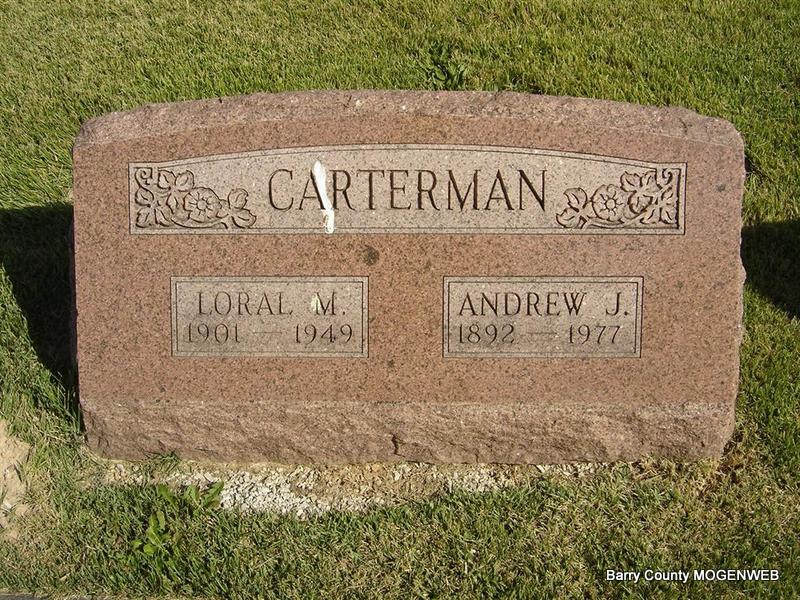 Aug. 1, 1977 | SSW: Loral - Research Note: Andrew was the husband of Loral M. Stockton. Son of Harvey Allen Carterman and Emoretta Beck. - SSDI: Name: Andrew Carterman, SSN: 496-07-7292, Last Residence: 65625 Cassville, Barry, Missouri, Born: 31 Dec 1892, Last Benefit: 65625 Cassville, Barry, Missouri, Died: Aug 1977, State (Year) SSN issued: Missouri (Before 1951) - World War I Draft Registration Cards, 1917-1918; Andrew Carterman, Age 24, born Dec. 31, 1892 Cassville, Barry Co., MO, Home address Cassville, MO, Self employed farmer near Cassville, single and sole support of mother., Date, June 5, 1917 - 1900 census: Name: Andrew J Carterman, [Andrew J Gorterman], Home in 1900: Flat Creek, Barry, Missouri, Age: 7, Birth Date: Dec 1892, Birthplace: Missouri, Race: White, Gender: Male, Relationship to Head of House: Son, Father's Name: Harvey, Father's Birthplace: Ohio, Mother's Name: Emersetta Carterna, Mother's Birthplace: Illinois, Marital Status: Single, Residence : Flat Creek Township, Barry, Missouri, Household Members: Name Age, Harvey Corterman 36, Emersetta Carterna Corterman 32, Millian M Corterman 11, Rosa E Carterman 9, Andrew J Carterman 7, Gertie E Carterman 6, Vesta A Carterman 2, - 1930 census Name: Andrew J Carterman, Home in 1930: Flat Creek, Barry, Missouri, Age: 37, Estimated birth year: abt 1893, Birthplace: Missouri, Relation to Head of House: Head, Spouse's name: Loral M, Race: White, Household Members: Name Age, Andrew J Carterman 37, Loral M Carterman 28, Irene Carterman 6, Joe Carterman 2 5/12, Pauline Carterman 3/12 | Note Donna Cooper Census Phyllis Long Photo Ted Roller |