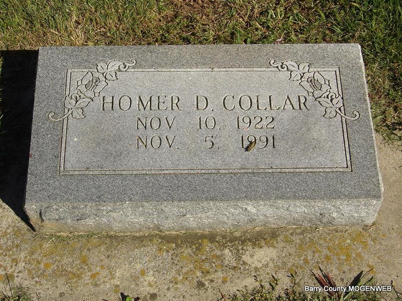 Research Note: He was a son of Albert Wesley and Effie (Woods) Collar, both born Missouri. - 1930 Census: Name: Homer D. Collar, Home in 1930: Mineral, Barry, Missouri, Age: 7, Estimated birth year: abt 1923, Relation to Head of House: Son, Father's Name: Albert W., Mother's Name: Effa E., Albert W. Collar 49, Effa E. Collar 46, Wesley I. Collar 17, Charles A. Collar 14, Emily G. Collar 10, Homer D. Collar 7 | Photo Ted Roller Census SS Claims Index Phyllis Long |
