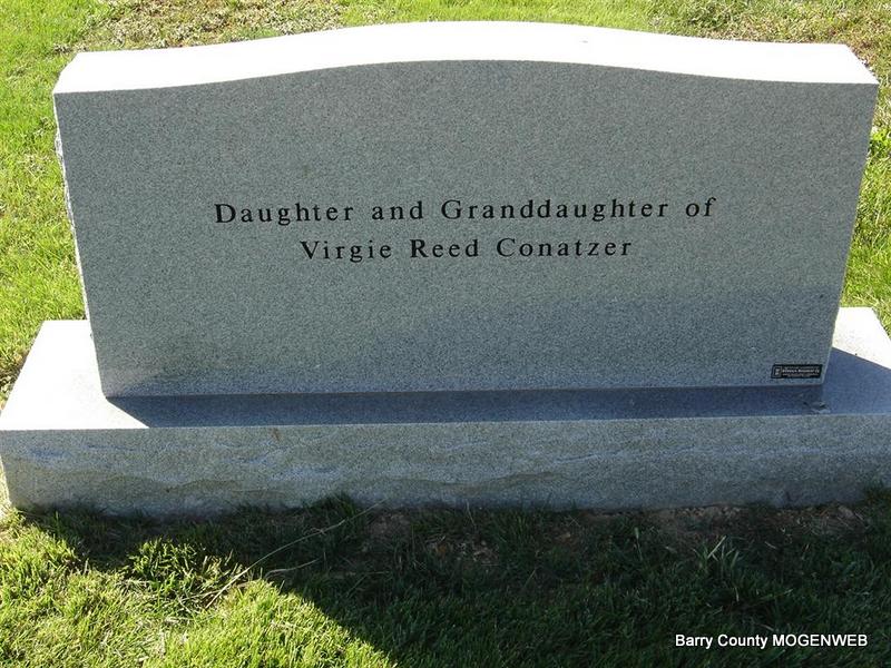 Research Note: Daughter of John P. Reed and Maggie Mae Lawson, buried at Oak Hill Cemetery. - 1930 Census, Barry Co., MO - Virgie is living with her parents, listed as single, age 28. Herman Reed, age 5, listed as a grandson to John and Maggie, her parents. - 1940 Census, Hogan, Mayes, Oklahoma - Virgie, age 37, is married to Alonzo B. "Dock" Conatzer, age 32 with Herman Reed, age 17, listed as step-son of Lonzo. - Ancestry data says that Herman was the son of Walter Trent and Virgie Reed. - This Cornett obit must be connected to Virgie or maybe Virgie's daughter? It reads - Cornett, Charles Elwood, 71, of Pryor, OK; born Dec. 1, 1930 in CO, died Dec. 14, 2002 in Pryor, OK; wife was the late Virgie Conatzer; father of one son (James of Pryor) and three daughters (Christine Vernon and Brenda Cornett, both of Pryor, and Charlotte); veteran of the U.S. Navy; services held Jan. 17 entrusted to Stephens Memorial Chapel; burial in Graham Cemetery. - Back of Stone | Photo Ted Roller Obit Donna Cooper Census Phyllis Long |