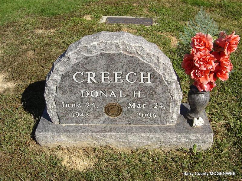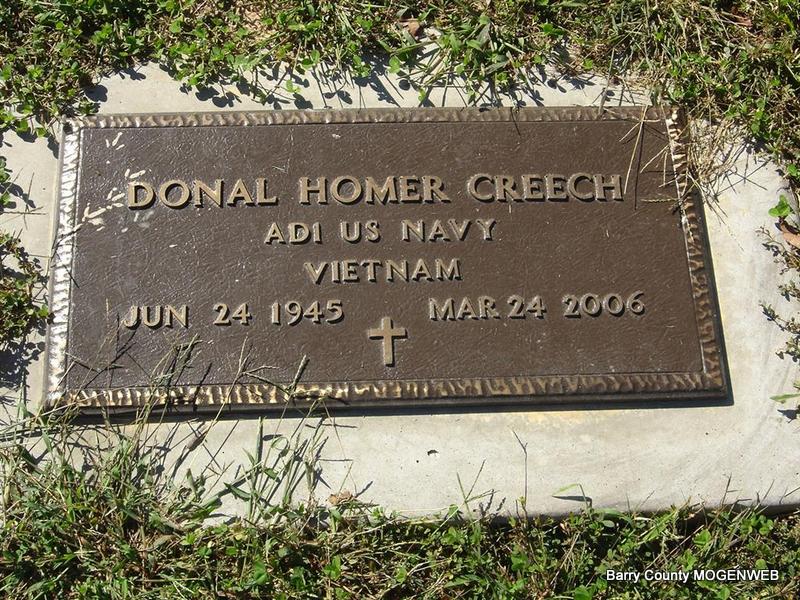 Research Note: He was a son of Lee and Ruth Edna (Davis) Creech, who preceded him in death. He was also preceded in death by one brother, Larry. He received his education in Rogers, Ark., where he grew up. He then entered the United States Navy, where he was a helicopter and jet mechanic. In 1969 he moved to Barry County and had resided at Purdy for 22 years. He was currently employed as a bulk feed truck driver for Purdy Farm Center. He was a very good mechanic and at auto body repairs. He was a member of AA for 17 years, of which he was very proud. Donal was killed in an accident unloading feed. - On July 9, 1968, he married Cecilia Louise Richardson in Clark Co., WA, divorced. - Military Stone Inscription: "API US NAVY VIETNAM" - Military Stone | Cassville Democrat Phyllis Long Photos Ted Roller |