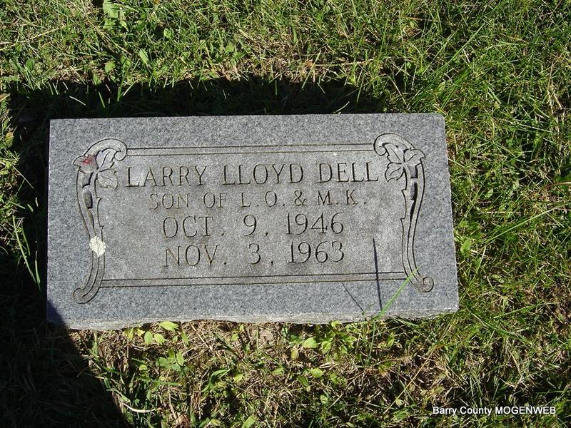 Inscription: "Son of L. O. and M. K." - Research Note: Son of Lloyd O. Dell and Murial Kathryn Bishop. His father was the informant on the death certificate. His car hit a bridge abutment on Hwy. 90, 1 mile S. of Noel, MO. Usual address was Star Rt., Pineville, McDonald Co., MO. | Death Certificate Phyllis Long Photo Ted Roller |