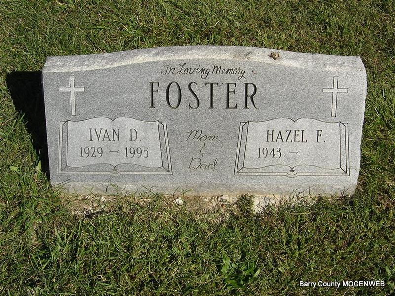 SSW: Hazel - Research Note: Son of Daniel I. Foster and Thelma M. Smith. Ivan Foster, age 21, first married Bonnie Jean Richardson, age 17, on June 7, 1950 in Carroll Co., AR. She second married Louis O. "Cotton" Periman and is buried at Mineral Springs Cemetery. His last residence was given as Cassville, Barry Co., MO, on his Social Security data. | Photo Ted Roller SS Claims Index AR Marriage Index Phyllis Long |