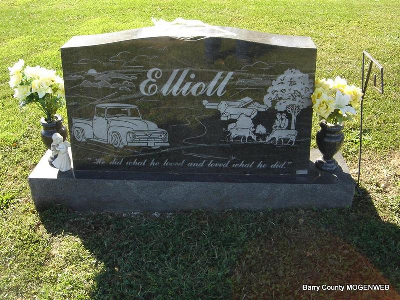 SSW: Mary Lois - Research Note: Culver's Funeral Home has listed that his father was Henry Clark Elliott and his mother Effie Lester. He was age 52 and he was a carpenter. His closest relative was Larry Elliott, Cassville, MO. Bro. Clovis Cook, Springfield, MO, preached his funeral. - Military Stone - Inscription: "MO SSGT US ARMY - WORLD WAR II " | Culver's Funeral Home, V. 15, P. 108, By Ted Roller Note Donna Cooper Photos Ted Roller |