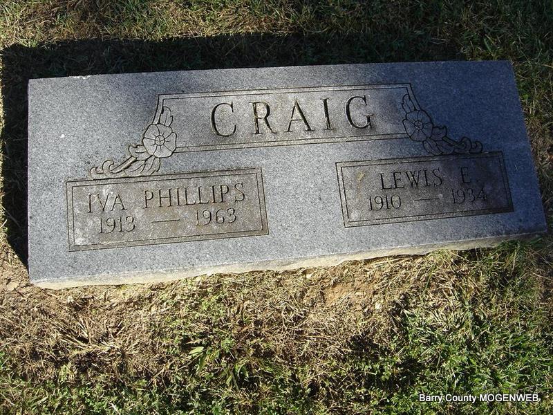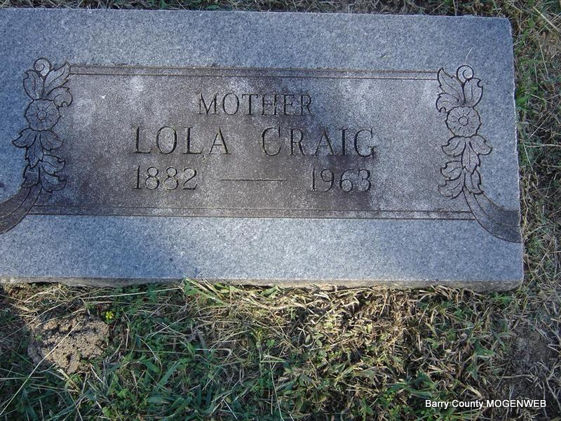 Research Note: She was the wife of William Harve Craig, and a daughter of Samuel and Cornelia Ann (Hall) Morgan. She was the mother of Roy Ray, Loyd E., Lewis Edward, Ralph E. and Thelma Pearl. Roy Craig of Cassville, MO was the informant on the death certificate. - William Harve Craig, age under 21, married Lola E. Morgan, age 21, on Mar. 8, 1904 in Barry Co., MO. William A. Craig, father of William, gave consent. William is buried at Mineral Springs Cemetery. | Photo Ted Roller Death Certificate MO Marriage Records Phyllis Long |