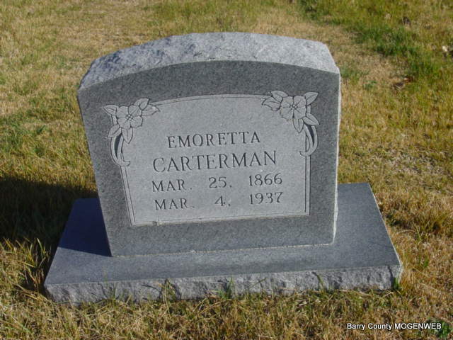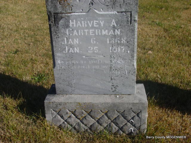 Research Note: According to his death certificate his father was Jacob Carterman, born PA, and his mother Rody Kelley, born Shelby Co., OH, and he was a farmer. The cause of death was tuberculosis of the lungs. His wife was Emorette Beck. - July 25, 1912, Thursday, Cassville Republican - Suburban News: Mrs. Barlow and children of Georgia arrived Tuesday to visit her brother, Harve Carterman and sister, Mrs. Henry Beck of Mt. Sinai. - August 8, 1912, Thursday, Cassville Republican - Suburban News: Harvey Carterman and sister Mrs. Barlow and four children departed Friday morning for a few days visit in Camden County with a sister. - October 31, 1912, Thursday, Cassville Republican - Suburban News: Mr. and Mrs. Sam Hilburn visited at Mrs. Hilburn's father, Harve Carterman, Saturday night and Sunday. - February 3, 1917, Saturday, Cassville Democrat - Card of Thanks: We wish to thank the friends and neighbors for their kindness during the sickness and death of our dear husband and father Harvey A. Carterman, who died Jan. 25, 1917. Mrs. H. A. Carterman, Mrs. Rhoda Hilburn, Andrew and Oniel Carter and Misses Gertrude, Ona and Alice Carterman. - 1910 Census Flat Creek, Barry, Missouri: Name: Harry A Canterman, [Harvey A Carterman], Age in 1910: 42, Estimated birth year: abt 1868, Birthplace: Ohio, Relation to Head of House: Head, Father's Birth Place: Ohio, Mother's Birth Place: Ohio, Spouse's name: Eoreta (Emorette), Home in 1910: Flat Creek, Barry, Missouri, Marital Status: Married, Race: White, Gender: Male, Household Members: Name Age, Harvey A Canterman 42, Eoreta Canterman 44, William M Canterman 20, Rhoda E Canterman 19, Andrew J Canterman 17, Gertha A Canterman 15, Vesta A Canterman 12, Alice V Canterman 9, Orvil M Canterman 7, Hover M Hicks 17 | Death Certificate Donna Cooper Online Newspapers Phyllis Long |
